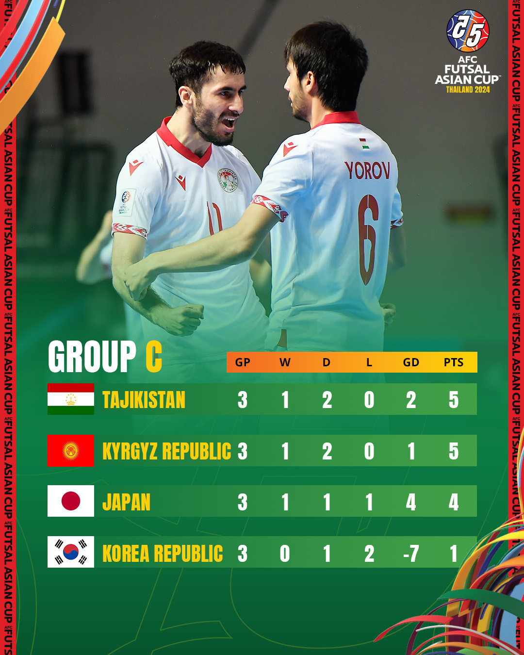 Để đối thủ cầm hòa 1-1, Nhật Bản chính thức trở thành cựu vương của giải Futsal châu Á. Không chỉ vậy, họ cũng mất luôn cơ hội cạnh tranh tấm vé dự World Cup Futsal. 2 đội đi tiếp ở bảng này là Kyrgyzstan và Tajikistan.