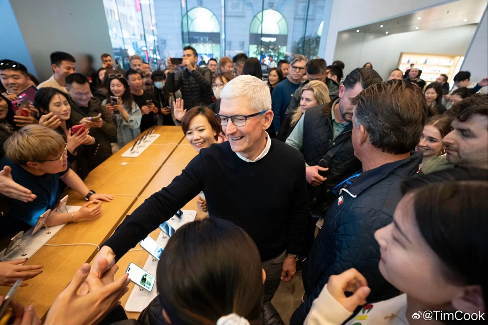 CEO Apple Tim Cook bắt tay khách hàng tại lễ khai trương cửa hàng bán lẻ mới ở Thượng Hải hôm 21/3. Ảnh: Weibo
